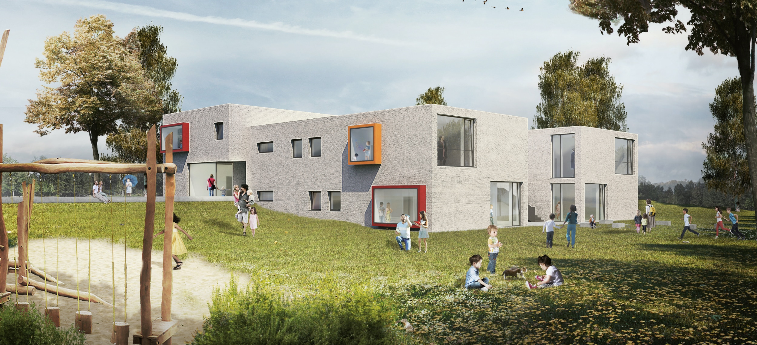 Durch verschiedene Fenstergrößen erhält die KiTa einen verspielten Charakter, der durch die farbig hervortretenden Sitzfenster verstärkt wird. Auch im Innenbereich werden die Gruppen durch farbige Akzente hervorgehoben und mit speziell designten Möbeln ausgestattet.